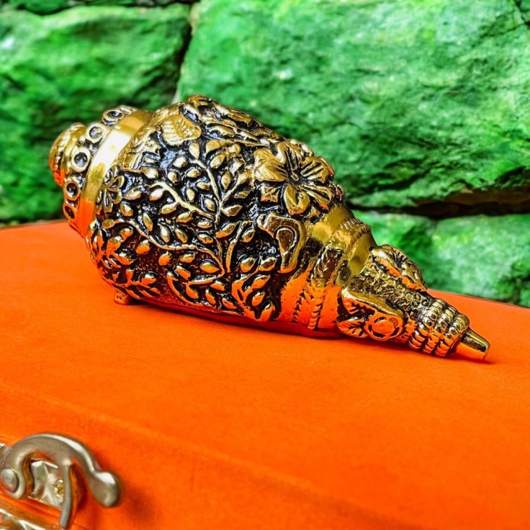 Crafted with precision from solid aluminium, this conch is a visual masterpiece. The finely embossed floral detailing offers a tactile and ornamental richness, making it an enchanting centerpiece for any sacred space or decor ensemble.